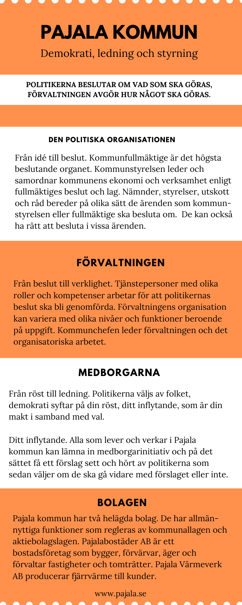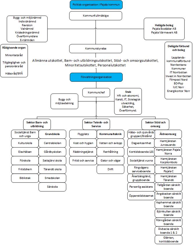 Nedan, under dokument, finns en kortfattad beskrivning över kommunens demokrati, ledning och styrning samt övergripande information om Pajala kommuns organisation, från fullmäktige ner till utskott i förhållande till den nuvarande förvaltningsorganisationen.