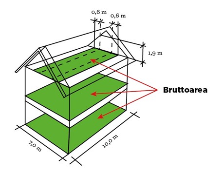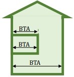 På skissen ovan markeras ytterväggarna med de mörkare linjerna. Alltså räknas både de mörkare och ljusare delarna in i BTA. Därmed ingår också väggar, trappor och inredningsenheter som köksskåp, garderober osv i uträkningen av bruttoarean.