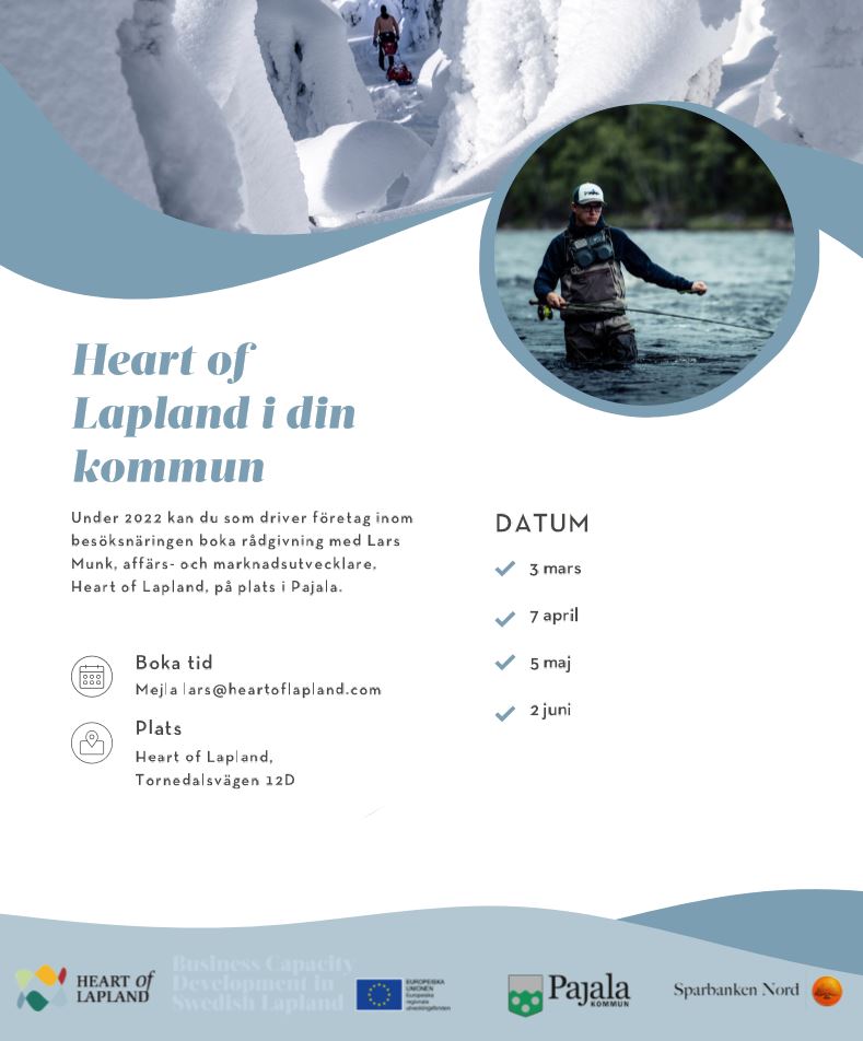 Under 2022 kan du som driver företag inom besöksnäringen boka rådgivning med Lars Munk, affärs- och marknadsutvecklare, Heart of Lapland, på plats i Pajala